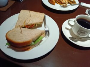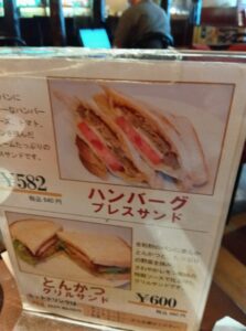 初めての喫茶店でしたので、お勧めの「デリシングルサンドレギュラーセット」と「ハンバーグプレスサンドセット」にしました。