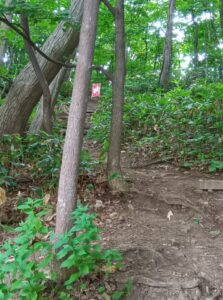 階段状の登山道を登っていくと、また、注意喚起の立て札が見えます。急いで近づいてみると、立ち入り禁止となっていました。「クマ出没注意喚起」の立て札の、ほんの数十m登ったところに「立ち入り禁止」の立て札です。これでは、実に紛らわしいと思いました。下にあった「クマ出没注意喚起」を「立ち入り禁止」に変えれば良いものを・・・。