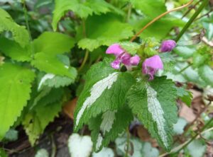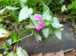 葉が白い斑入りげ、可愛らしいピンク色の花を咲かせています。