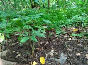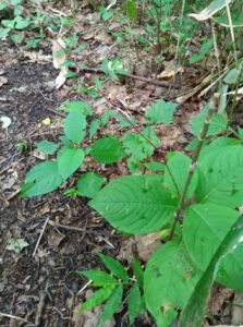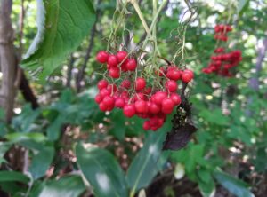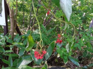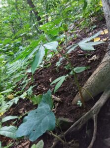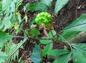 ぬかるみにはなっていませんが、歩きづらい登山道を黙々と山頂を目指しました。上を目指していると岩場が今にも滑りそうで、登りより特に下山時は気をつけなければと思いました。登山道の太い樹木の根元に生えている「コウライテンナンショウ」(マムシグサ)が山頂間近を示しています。実は、まだ、色づき始めてはいませんが、一粒一粒の黄緑色の実が先日より大きくなったようです。山頂までひと頑張りです。
