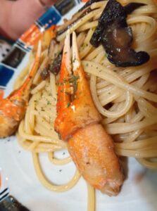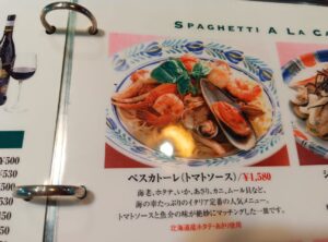 「月に一度、月末の金曜日午後5時からお決まりのレストランでカレーライスを食べながら夕食を・・・。」と、約束をしている友人がいます。かれこれ5年近くも続いているでしょうか。今日は金曜日ではなかったのですが、友人の都合で急遽曜日変更となりました。いつものカレーライスではなく残念な思いもありましたが、「スパゲッティ専門店」なのでスパゲティのメニューは豊富です。イタリア語はよくわかりませんが、さまざまな魚介類入りの「ペスカトーレ」にしてみました。友人はシンプルなカニスパゲッティです。コーヒーが大好きな二人にとっては、食事の後のコーヒーもまた格別の美味しさでした。