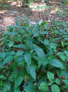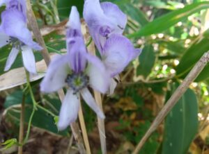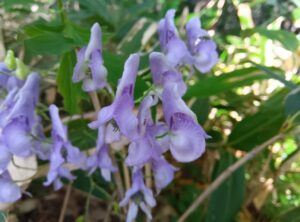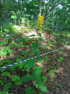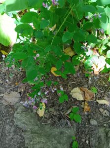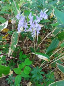 草深い「哲学の道」を進むと、右側の土手は藪が茂っているので今にもクマさんに遭ってしまいそうな気配がします。けれども、入山禁止が解かれましたので心強いです。岩場から九十九坂を過ぎると平坦な登山道が続きます。その登山道に、一株のうっすらと青みを帯びた花が咲いていました。「トリカブト」です。毒があるそうですが、花は眺めると綺麗です。