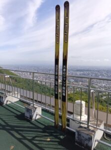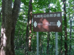 階段状の登山道を登り切ると「熊注意」の標識がありそこを左折します。数年前にはこの辺りにも山野草が見られましたが、今は笹藪が主役のようになってしまいました。アップダウンを繰り返しながら進むと、左手に「大倉山」ジャンプ台リフトが見えてきました。