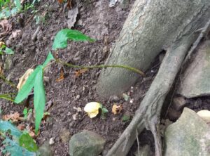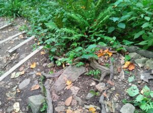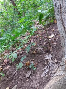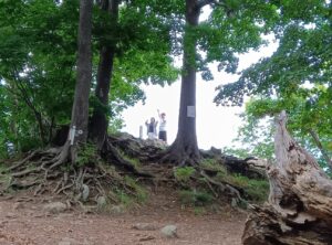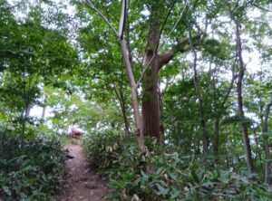 もう間も無く山頂です。太い樹木の根元の「コウナンテンナンショウ」(マムシグサ)」の実は、熟してきたでしょうか。ところがその樹木の根元をどう見回しても、「コウライテンナンショウ」(マムシグサ)は、全く見当たらないのです。ここを訪れる度にその生長をカメラに収めホームページに記載してきました。まさか、『盗掘』でなければ良いのですが・・・。