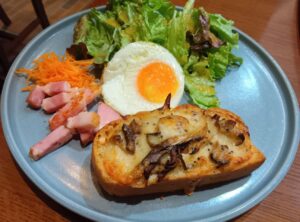 「日替わりモーニング」の様々なメニューから、どれにしようかと迷った挙句「きのことホワイトソースのタルティーヌとセットコーヒー」にしました。ピザ風のパンが美味しそうだったからです。そして、タルティーヌとはどのようなお味なのかと興味もありました。