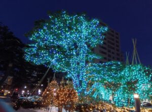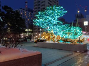 S T V札幌放送局の横を通ると、青色と金色のイルミネーションが輝いていました。自分なりにリッチな食事をし「クリスマス」ムードたっぷりな中を家路につきました。「大通公園」では更に豪華なイルミネーションで綺麗だろうと想像できます。少し、道を変えて「大通公園」を歩けば良かったと暫くしてから気づきました。滅多に夜道を歩きませんので、残念な思いでした。