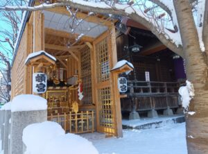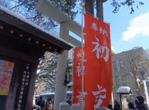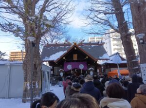 神頼みという訳でもありませんが、新年にあたり「北海道神宮頓宮」へ初詣に出かけました。例年、「北海道神宮」はお正月三ヶ日のはかなりの人出になりますので、今年は「北海道神宮頓宮」への初詣を考えました。こじんまりとした神宮ですが、午前中には正門の外まで並んでいる程、初詣の人で混み合っていました。「北海道神宮」ほどではありませんので、歩道から正門前まで並んで待つことにしました。歩道は、結構なツルツル路面でしたので足元に気をつけながら進みました。この辺りの歩道はロードヒーリングされていないのが残念です。やっと、門を潜ると四列になり整然と進みました。30分位並んで待っていたでしょうか。