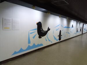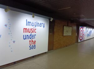 「魚・タコ・イカ・海藻類など海の様子を表した海の壁画」が500mの地下コンコースに描かれ
