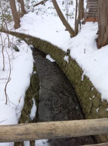 「登山口」入口のせせらぎにかかる橋から流れをみると、一週間前には凍りついていましたがすっかり溶けています。さすが登山道は雪道ですが、ザラザラとした粒状です。登山靴に一応スノーアイゼンを付けて歩き始めると、カタカタカタというヤマゲラが樹木を突っつく音が森一面に響き渡っていました。もう野鳥たちの活動は始まっていました。