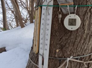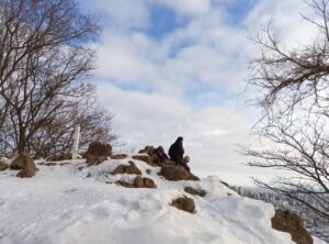 今日も登山者が多いので、特等席(山頂の岩)はお預けとなりました。さすが山頂は、温度計が−0・3℃を示しています。