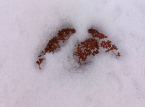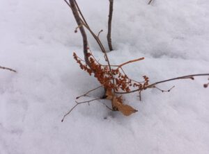 雪に埋もれていた枯れた「ヤマアジサイ」の花が