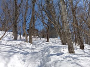 朝から気持ちの良い青空が広がっています。この冬初めての「藻岩山」登山です。自宅から「藻岩山」登山口までは徒歩で1時間ほどかかります。登山口に向かって歩いていたところうっかり行き過ぎてしまい若干戻らなければならないはめになってしまいました。右上の方にに見えていたはずの「藻岩山」山頂が、気づいたら右後ろ上の方に見えるようになっていたのです。他のことを考え、一瞬ボーっとしていたのでしょうか。直進してきた歩道を右折すると「藻岩山」登山口へを、左折し多少ロスをしながら「慈啓会病院」登山口着です。
