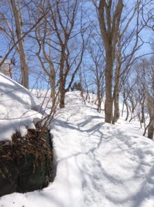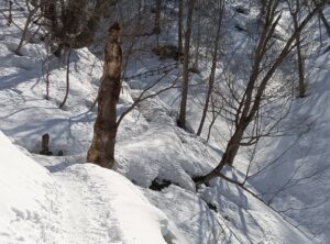 その後登山道は圧雪状態体なので、足を取られることもなく進めました。夏場の登山道には数カ所に苦手な岩場があります。