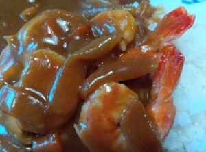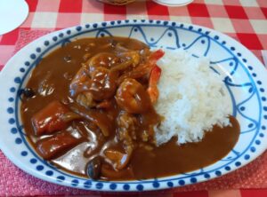 〜 エビやホタテなど 〜 いつもはレストランにはいらっしゃらない旦那様が「海鮮カレー」を運んでくださいました。カレーの仕込みは二日間もかけてなさっていると、ニコニコしながら語っていました。