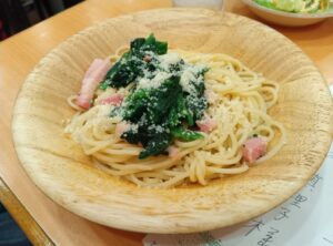 岩見沢からの友人は「ほうれん草のスパゲッテイ セット」と「小エビのサラダ」を