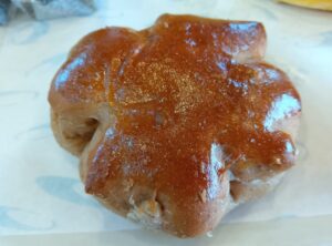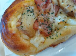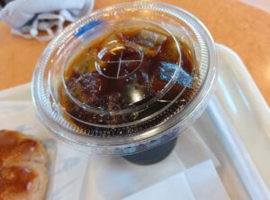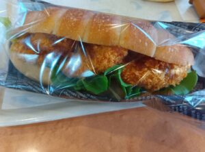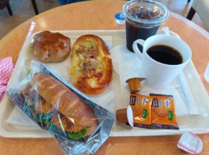 身内は「黄金生姜メンチカツサンド」とアイスコーヒーを、自身は「北海道産チーズ燻しベーコン」・「クルミパン」そしてブレンドコーヒーのホットです。クッキー1個がそれぞれにセットされています。
