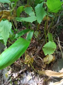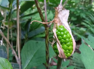 下山していると登っている時には気付かなかった「コウライテンナンショウ」(マムシグサ)の大きな黄緑色の実を見つけました。この登山道で「コウライテンナンショウ」(マムシグサ)の実は見られないと思っていましたので、ホッとしました。色づいていく過程を見守っていきたいものです。