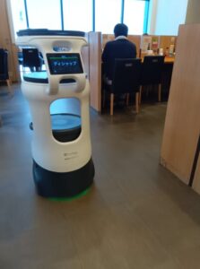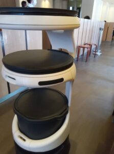 背丈ほどのロボットが注文した食事を素早く運んでくれるので驚きながらも