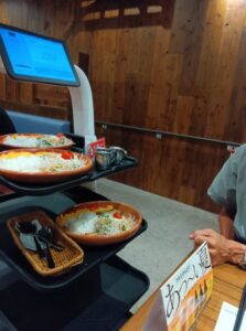 入り口の「トマト弾けるハンバーグ」の看板に誘われ入店すると、ハンバーグ系のメニューから「角切りトマトのオムバーグディッシュ」のSサイズ、弟たちはMサイズにしました。ここでもビックリです。ロボットが運んでくれました。