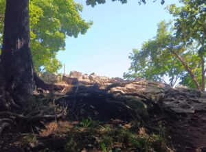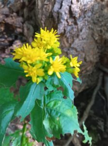 その横の巨樹の根元の植物は、これまで葉と茎が生えていたのですが、黄色い花を咲かせていました。何と「アキノキリンソウ」です。山頂までの登山道には全く見られなかった「アキノキリンソウ」に感動しました。
