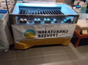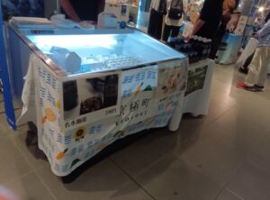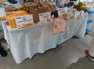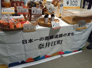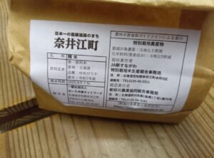 日本一の直線道路のまち「奈井江町」は「トマトラスク」、「トマトジュース」、「しいたけ」、「しいたけ醤油」、「新米」です。お米をジョッキですくいどりしますので、挑戦してみました。新米の「ゆめぴりか」すくいどり一回300円です。新米に釣られてしまいました。