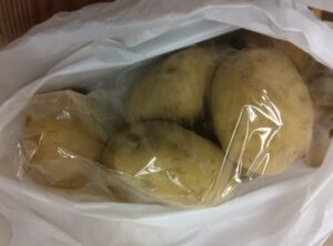 ビニール袋一枚に「じゃがいも」を詰め込めるだけ詰め込ませます。皮の薄い「新じゃが」でした。10個くらいになりましたので、市販されている「じゃがいも」よりお得感があったでしょうか?