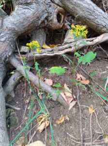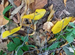 山頂の樹木の葉は紅葉しているのと黄葉しているのとがあり、見応えがあります。巨樹の根元に密集して生えていた黄色い花を咲かせている「アキノキリンソウ」は、数株を残すのみとなってしまいました。