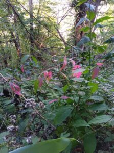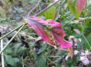 下山し始めると、紅葉している「キンミズヒキ」を見つけました。一瞬、まるで薄紅色の花が咲いているように見えます。