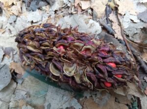 すると大きな木の実を見つけました。「ホウノキ」の実です。小さな赤い種が規則正しく並んでいます。着けていた手袋と一緒に写真を撮りましたので、その実の大きさがわかります。約10cmはあるでしょうか。