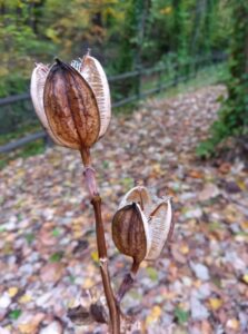 僅か数本を残すのみとなってしまった「オオウバユリ」の実はすっかり枯れてしまい種も落ちてしまい、実の殻を残すのみとなっています。