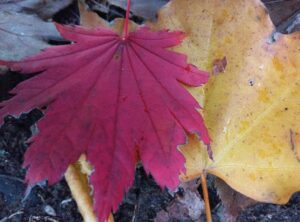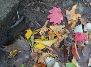 黄色い落ち葉が多い中で、真っ赤な楓の葉を見つけました。