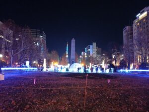 11月初旬に寒波が押し寄せ急に寒くなり積雪がありました。このまま冬へ一直線に向かうものと思っていましたが、最近はその寒さも一段落したようです。歩道の積雪はほとんどなくなりました。寒さを避けようとどうしてもチカホを通ってしまいます。午後5時から点灯する「ホワイトイルミネーション」を楽しみに、「大通ビッセ」から地上に出て「大通公園」へ出掛けて見ました。