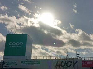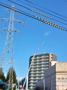 水分補給を終え、「C0OPさっぽろ」を出て信号待ちをしていると、高く伸びている工事中のクレーン車が青空に映え美しい光景でした。