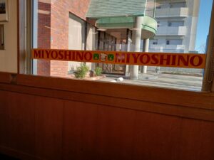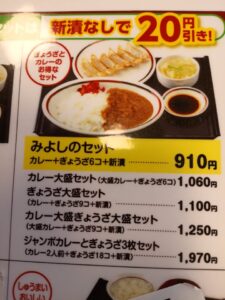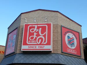 今日のメイン「みよしの」の看板が見えてきました。どうやら「ぎょうざのみよしの」には、「ぎょうざ」以外にも「カレー」もあるようです。