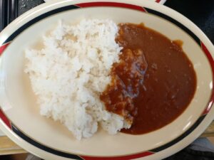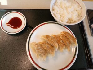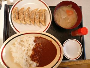 「ぎょうざ」が六個と味噌汁を豚汁に換えた汁物と「カレーライス」の「みよしのセット Mサイズ」です。