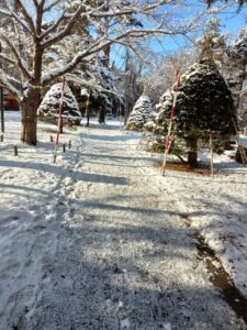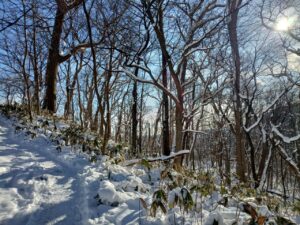 樹木は、まるで綿帽子をかぶっているようです。太陽に照らされていると、登山口への道の雪も溶けかかっていました。