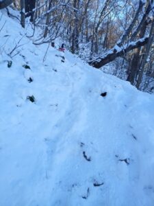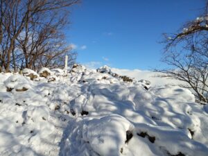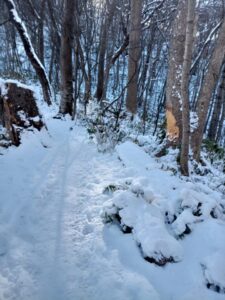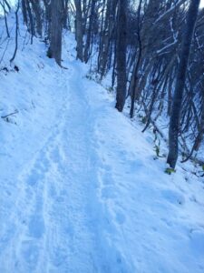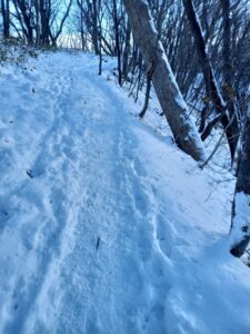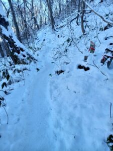 もう間も無く、僅かな下り坂が続きその後一気に急登となります。前回、この辺りの登山道は落ち葉で埋め尽くされていましたが、新雪が登山道を白い世界に替えてしまいました。