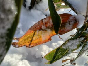色とりどりに咲いている花も綺麗な色や形の落ち葉なども全く見られなくなった冬の「円山」ですが、雪と春を待つ植物との何気ない関わりが楽しいです。