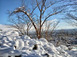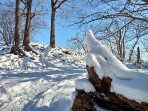 ひと頑張りすると、山頂が見えてきます。この辺りには階段があったはずですが、降り積もった雪の下になってしまったようです。市街地より「円山」の降雪は多く、低山とは言え侮れません。