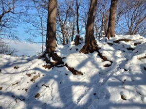 数日間の降雪からやっと低温ながら晴天に恵まれ「円山」登山口へ向かいました。夜間の低温と日中の+気温のせいでツルツル路面を転ばないようになんとかここまで歩いてきました。低い太陽が日差しを斜めに差し込んでいます。登山口へ向かう道には、樹木の長い影ができていました。