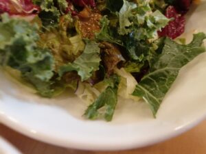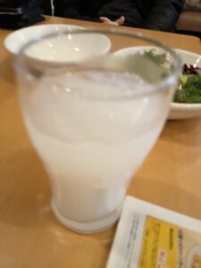 ロボットが通路に沿ってメインの料理運んでいます。予想していた以上に動きが速く写真に撮るのも大変で、あっという間に過ぎ去ってしまいます。数枚失敗してしまい、やっとこちら向きの写真が撮れました。「サラダ」は従業員さんでしたが、「チーズインハンバーグ」と「和善 黒酢唐揚げ」はロボット君です。