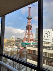 「そば・うどん家族亭」の前には「年越しそば」などをお目当てに10数人の人たちが空席を待っていました。ぼーっと外を眺めてみると、「家族亭」のある「丸井今井本店新館10階」は、丁度、「さっぽろテレビ塔」が目の前でデジタル時計辺りと同じ高さです。30分近く待ってから入店しました。