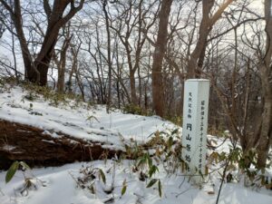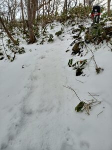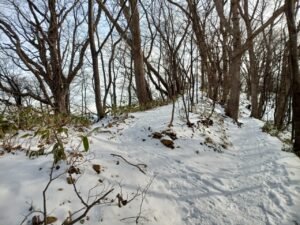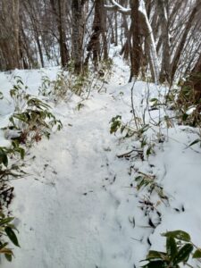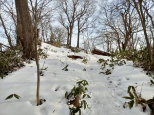 「切り株」や「クマザサ」にアート気分にさせていただいていると、間も無く山頂が近づき階段状の登山道は雪に埋もれ細い坂道になってしまいました。