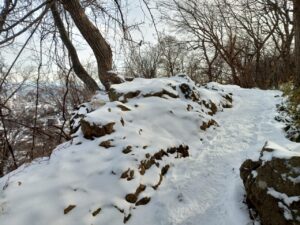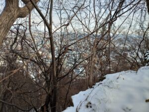 途中の市街地が見渡せる小高い登山道に、切り倒した樹木の切り口がニコちゃんマークの様に雪が残り