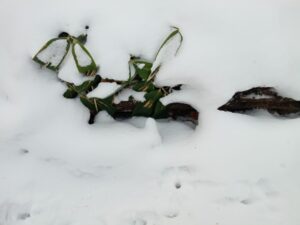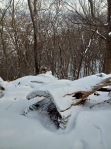 雪に埋もれ朽ちていく伐採された樹木がありました。