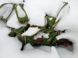 「クマザサ」の葉が雪の重みで立体的なアートを作っています。