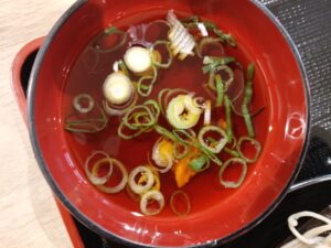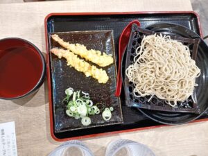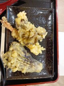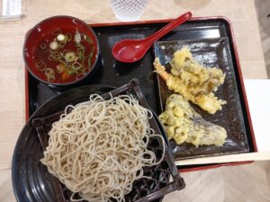 同様に冷たいお蕎麦を注文し、つけタレもいただきました。天ぷらは、舞茸天・えび天・ナス天です。トッピングとして小口切りの長ネギです。