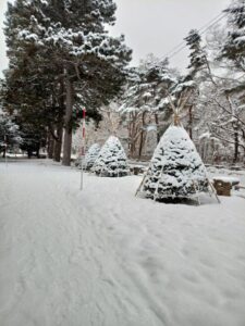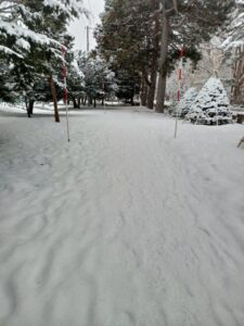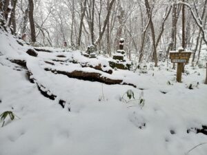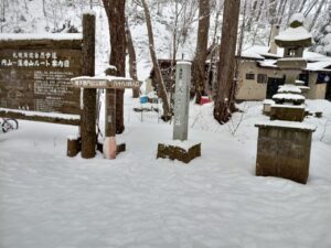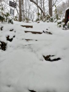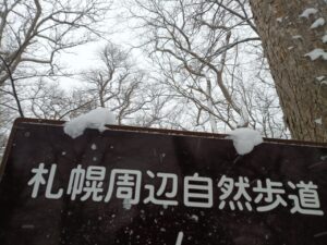 早朝から小雪が降ったり止んだりの空模様です。時折、青空がさっと顔を見せますが雲の方が勝っていてスッキリとした青空は期待できない様です。少し早起きして円山登山口へ向かいました。ツルツル路面上に昨夜からの降雪で歩道は真っ白です。