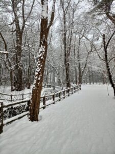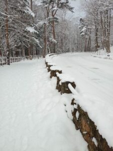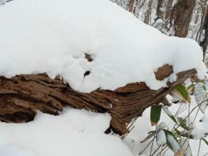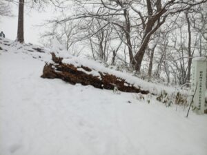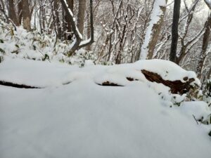 伐採され横に転がっている巨木の上にも新雪が降り積もっています。