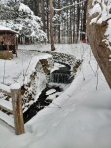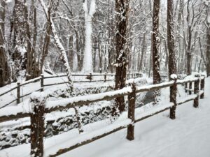 樹木や「円山川」に沿った囲いは新雪に覆われています。早朝のせいかお正月2日のせいか、踏みしめた靴跡は少なく今日の登山者は少ない様です。